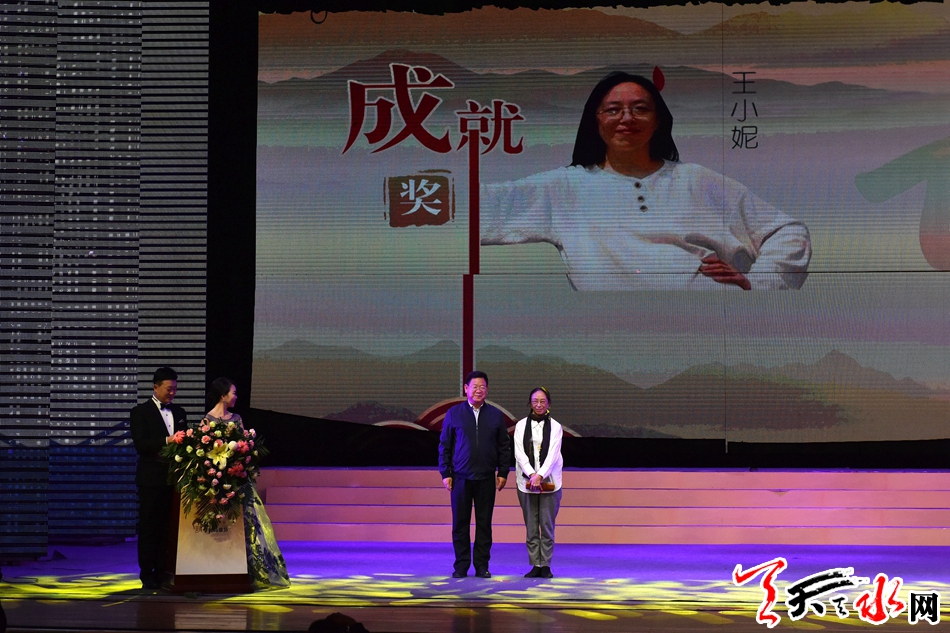 天水市委常委、宣传部部长张建杰为最高奖成就奖获奖者王小妮颁奖
