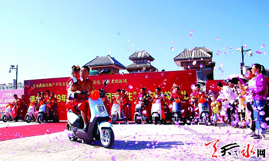8月7日是我国的传统节日七夕,清水县在轩辕湖公园举办第二届“缘定清水·携手一生”七夕集体婚礼活动,14对新人身穿中式传统婚服,在人们的祝福中喜结连理,共同倡导婚俗文明新风尚。婚礼现场,14对新人依次进行结红绸、跨马鞍、跨火盆、射弓箭、拜天地、合卺礼、结发礼、执手礼等具有传统文化寓意的汉式礼仪,隆重庄严、华而不俗、喜而不闹。参加集体婚礼的14对新人,有忠诚守护国土的现役军人,有服务乡村一线的干部职工,也有主动脱贫致富的贫困群众。他们以实际行动践行婚俗新风,切实改革陈旧婚俗,引领社会新风尚。