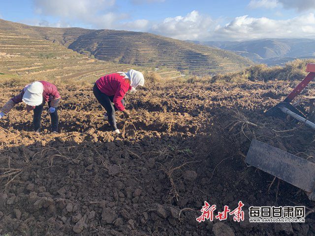 宕昌县拉路梁中药材绿色标准化生产基地药材收获现场。