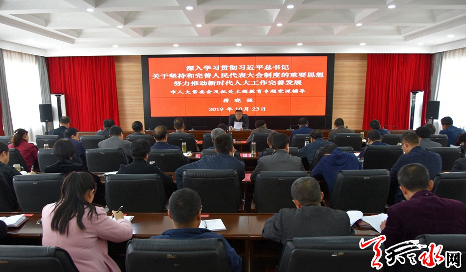 天天天水网讯【全媒体记者马放】10月23日,市人大常委会及机关举行主题教育专题党课。市人大常委会党组书记、主任蒋晓强以《深入学习贯彻习近平总书记关于坚持和完善人民代表大会制度的重要思想 努力推动新时代人大工作完善发展》为主题作专题党课辅导报告。市人大常委会党组成员宋建平、王晓琴、杨坤及机关党员和其他干部职工聆听党课。