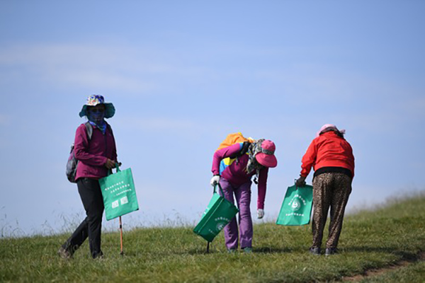 甘肃甘南藏族自治州环境保护协会的志愿者在草原上捡垃圾