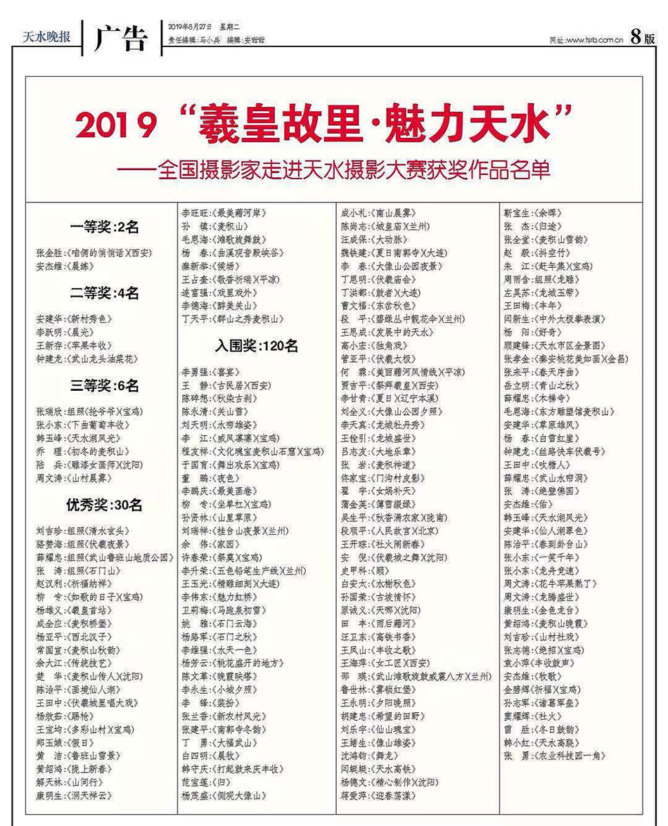 据了解,本次活动由市文化和旅游局、天水日报社主办,天水晚报承办,活动从今年4月启动,历时半年的征稿、采风、评奖等过程,在全国摄影爱好者的大力支持下,共征集到参赛作品5000余幅,国际国内摄影爱好者400余人参与。邀请资深摄影家担任评委,共评出一等奖2名,二等奖4名,三等奖6名,优秀奖30名,入围奖120名。