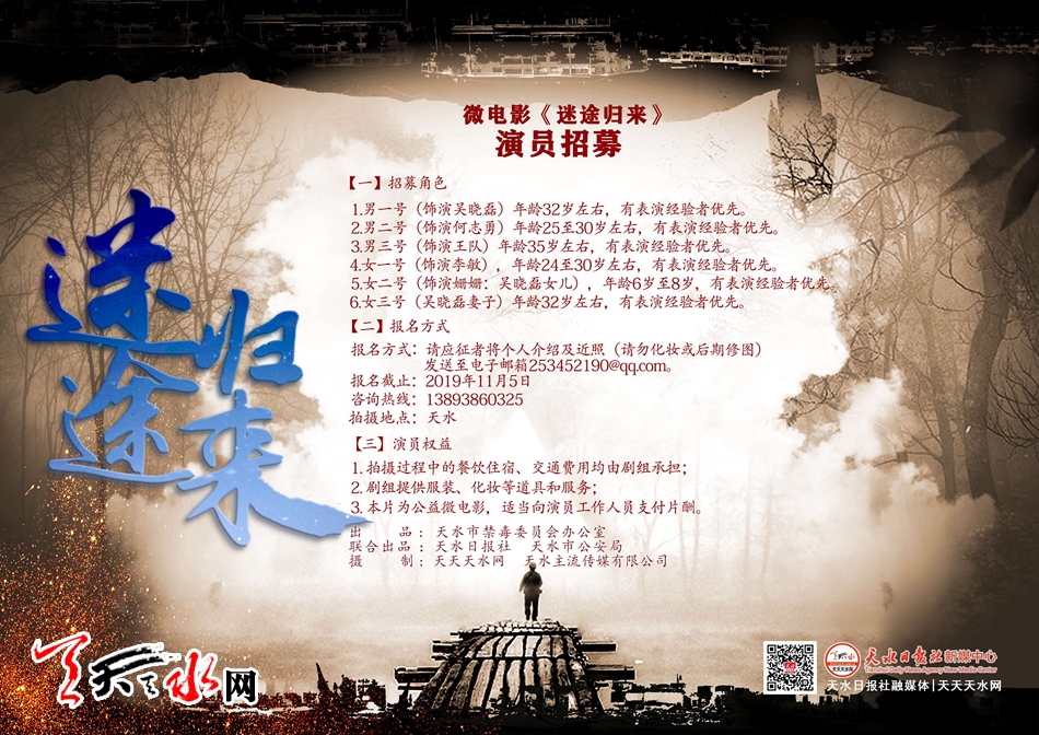由天水市禁毒委员会办公室、天水日报社、天水市公安局联合出品,天水日报社新媒中心独立创拍的禁毒微电影《迷途归来》(暂定)是一部讲述我市禁毒战线上涌现出现感人事迹。吴晓磊(男一号)原本有着幸福的家庭,因为沾染毒品导致家庭破裂,他因此还走上了以贩养吸的违法道路。在一次聚众吸毒中,吴晓磊被禁毒警察抓获,为了揪出更大的毒贩,警察对吴晓磊进行多次审讯,然而吴晓磊故意装糊涂,始终不肯说出背后的毒贩。禁毒警察何志勇(男二号)、李敏(女一号)李敏因为同情吴晓磊家庭,吴晓磊被抓后,时常对他的妻子和女儿进行帮助,彼此间渐渐产生了信任和感情……该片主要以吸毒、贩毒、惩戒毒贩、戒毒为主线,以微电影的视角反映毒品对个人、对家庭、对社会的严重危害,体现了天水市禁毒警察严格执法,无私奉献的精神和良好形象,有着强烈的警示作用,对于我市开展禁毒预防教育、提高毒品危害认知能力将起到积极作用。