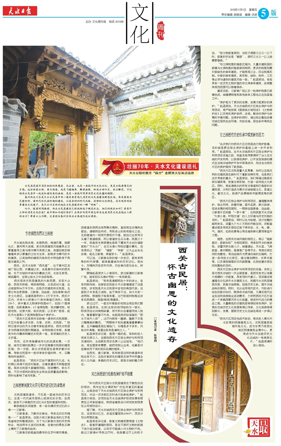 “针对西关片区部分古民居建筑处于濒危状况的现状,我市在充分调研和广泛征求意见的基础上,全面启动了天水古城西关片区综合保护与利用项目,对这一历史街区及时进行抢救性保护。”赵昌荣介绍说,该项目由天水名城保护投资发展有限责任公司承担建设,陕西省建筑设计研究院有限责任公司规划设计。