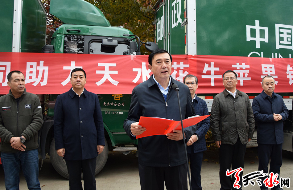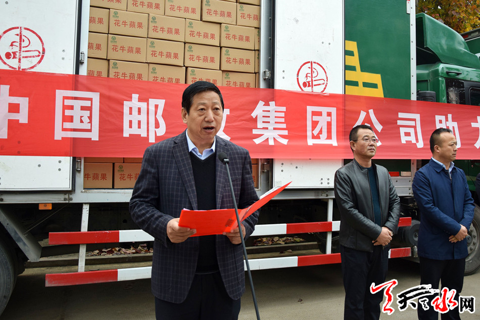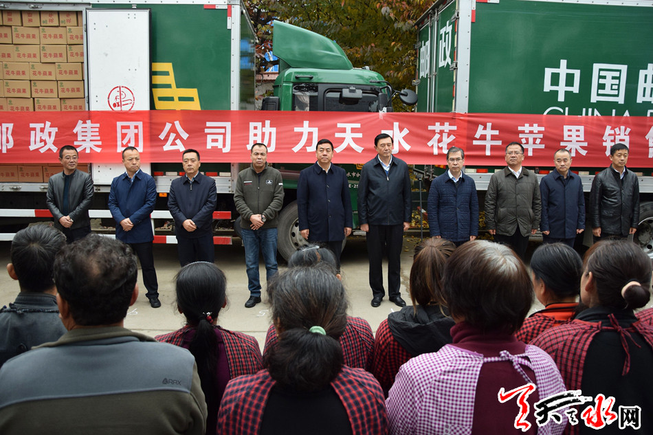 天天天水网讯【全媒体记者冯丽娟】11月3日,中国邮政集团助力天水花牛苹果销售发车仪式在麦积区花牛镇举行,首批20吨花牛苹果搭上天水——北京邮车发往北京。