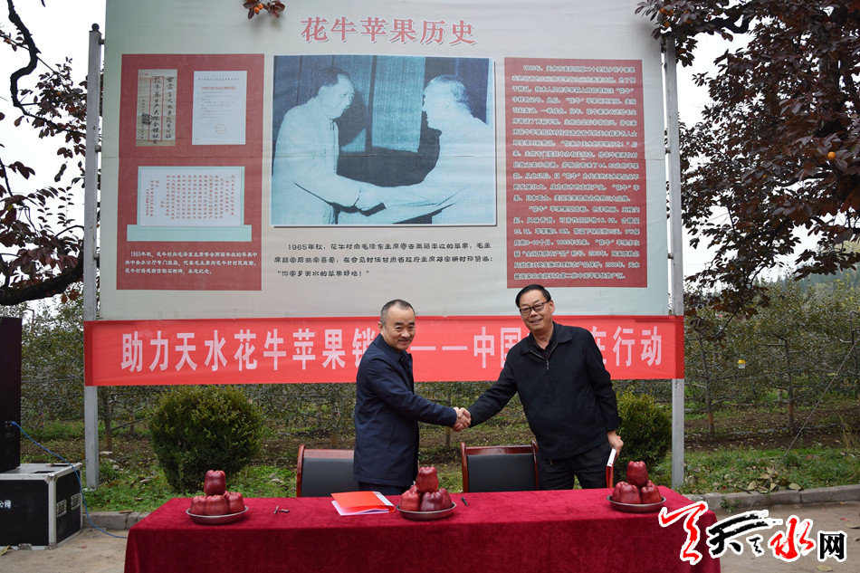 发车仪式上,天水市邮政分公司和天水市苹果产业协会签订了产品购销协议书,按照协议,在本次首批向北京发送花牛苹果20吨之后,我市还将陆续向全国各地邮政系统发送天水苹果。