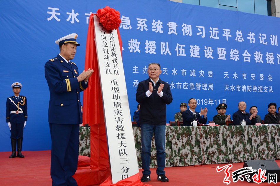 王锐和张鸿斌率先为省消防救援总队综合应急救援机动支队重型地质灾害救援大队三分队揭牌。市应急管理局与驻军和社会救援队伍签订军地应急联动、社会救援力量战略合作框架协议,与会领导为15支专业救援队授牌授旗。