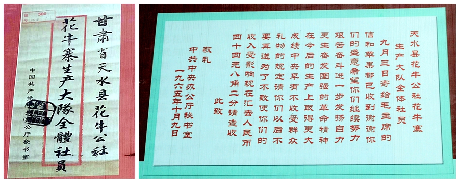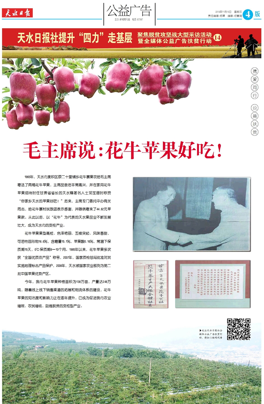 1965年,天水市麦积区原二十里铺乡花牛寨果农给毛主席寄送了两箱花牛苹果,主席品尝后非常高兴,并在家用花牛苹果招待时任甘肃省省长的天水籍著名人士邓宝珊时称赞“你家乡天水的苹果好吃!”后来,主席专门委托中办有关同志,给花牛寨村民致函表示感谢,并随信寄来了44.82元苹果款。从此以后,以“花牛”为代表的天水果品业不断发展壮大,成为天水市的支柱产业。