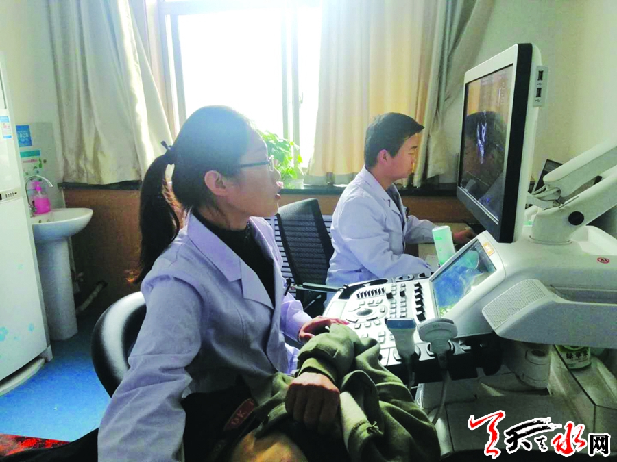 11月6日,记者来到武山县人民医院,看见陈海静正在给一位病人做B超,她一边操作一边向同事讲解需要注意的相关事项,同时还和病人细心的沟通,询问病情。