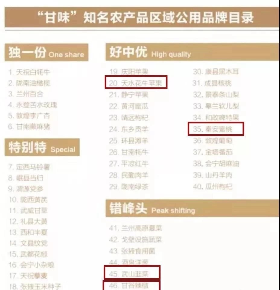"好中优"22个:分别是庆阳苹果、天水花牛苹果、静宁苹果、黄河蜜瓜、靖远枸杞、东乡贡羊、环县滩羊、甘南牦牛、平凉红牛、民勤肉羊、陇南绿茶、康县黑木耳、成县核桃、景泰条山梨、皋兰软儿梨、和政啤特果、秦安蜜桃、敦煌葡萄、金塔番茄、会宁胡麻油、山丹羊肉、瓜州枸杞;