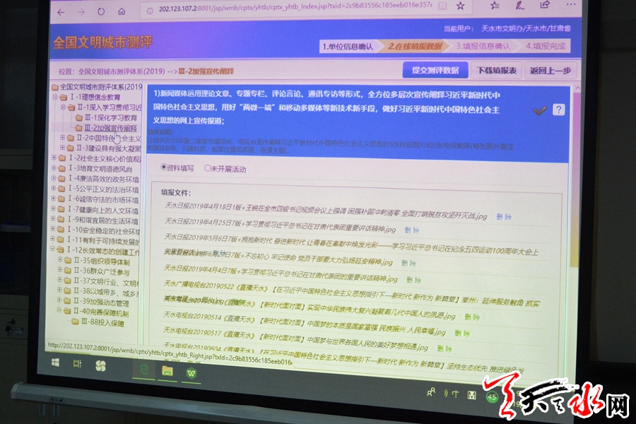 天天天水网讯【全媒体记者郝勤学】11月17日,市委常委、宣传部部长张建杰到市文明办检查指导全国文明城市创建工作,并向中央文明办点击提交我市创建全国文明城市网上申报材料。