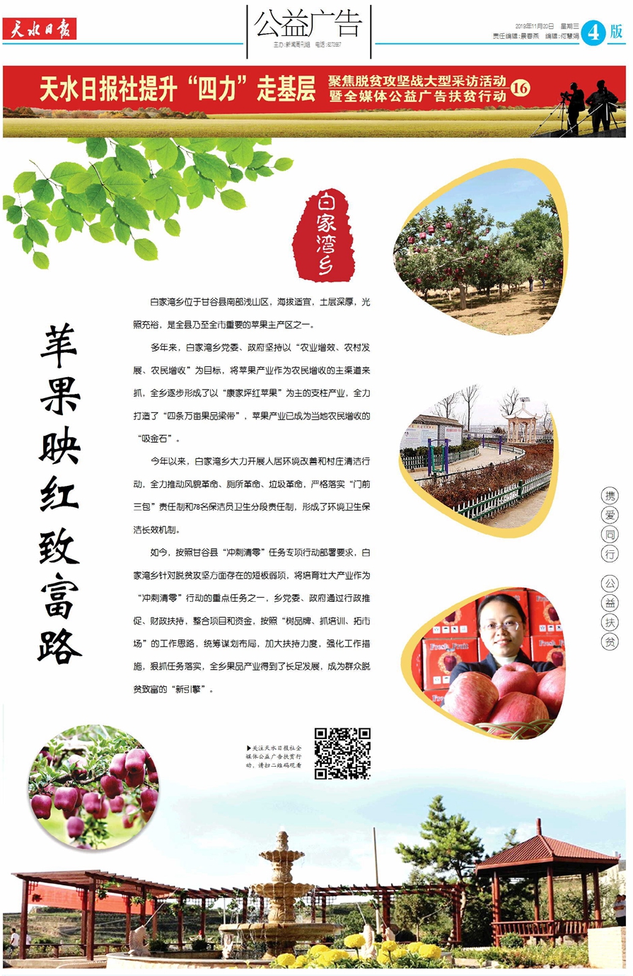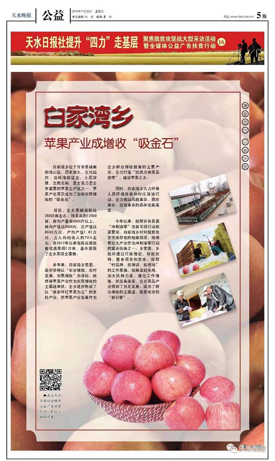 白家湾乡位于甘谷县城南部浅山区,当地海拔适宜,土层深厚,光照充裕,是全县乃至全市重要的苹果主产区之一,苹果产业真正成为了当地农民增收的“吸金石”。 多年来,白家湾乡党委、政府坚持以“农业増效、农村发展、农民增收”为目标,始终将苹果产业作为农民增收的主渠道来抓,全乡逐步形成了以“康家坪红苹果为主”的支柱产业,把苹果产业发展作为全乡群众增收致富的主要产业,全力打造“四条万亩果品梁带”,建设苹果之乡。