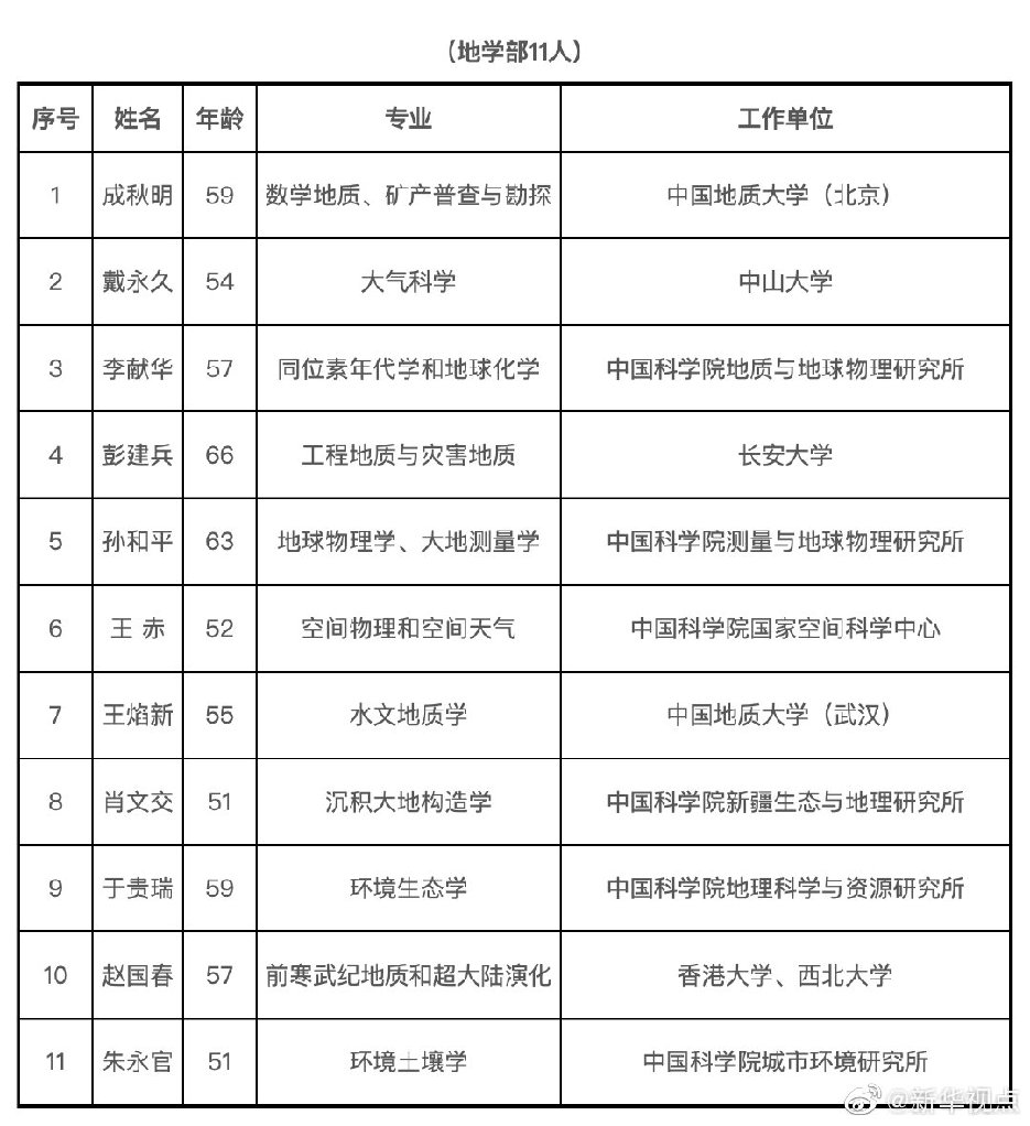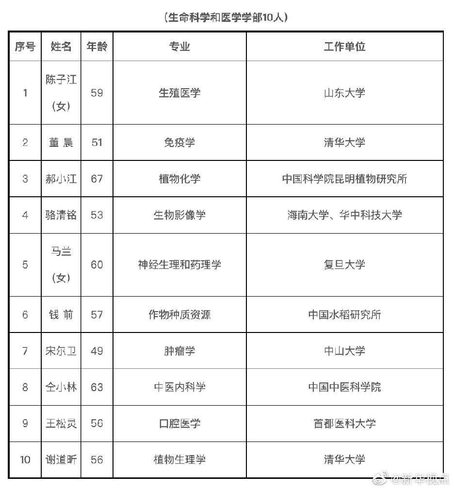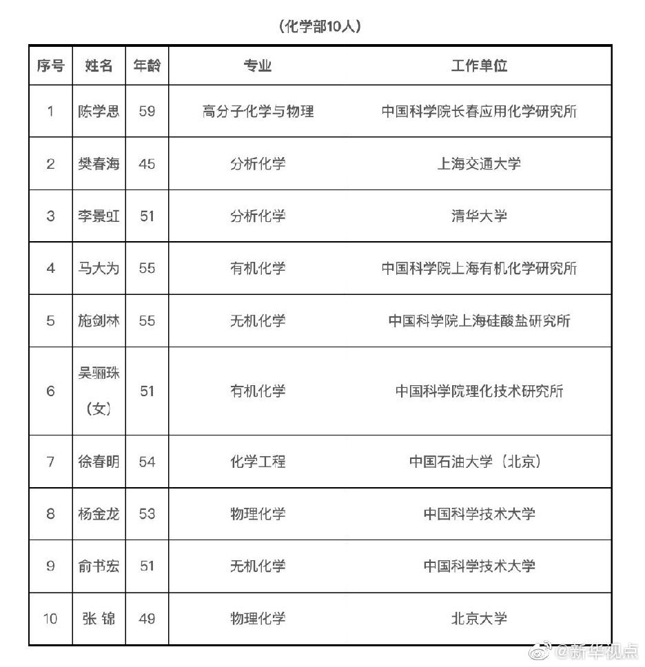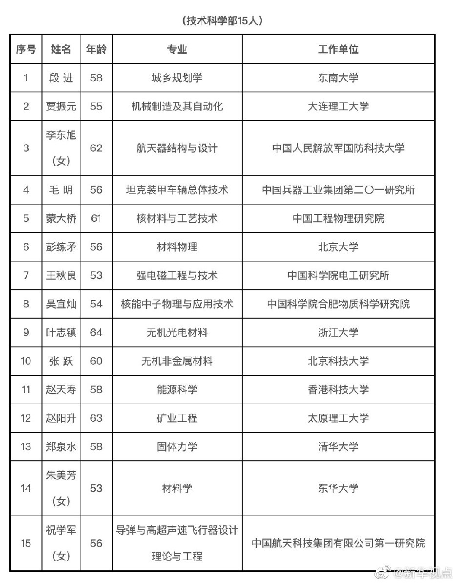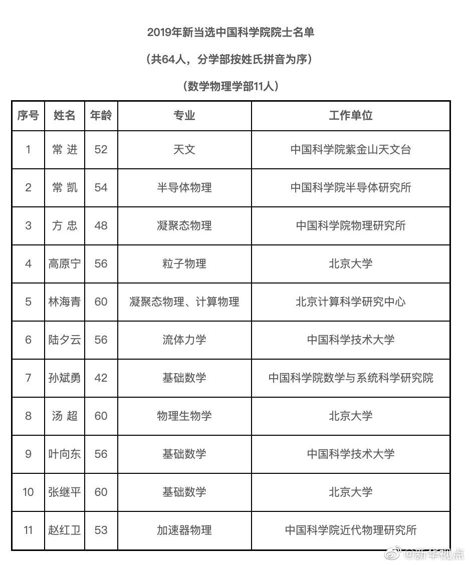 今天,2019年中国科学院院士增选结果揭晓,共选举产生了64名中国科学院院士。其中,数学物理学部11人,化学部10人,生命科学和医学学部10人,地学部11人,信息技术科学部7人,技术科学部15人。新当选院士中,年龄最小42岁,最大67岁;女性6名。另外,还有20名中国科学院外籍院士当选。