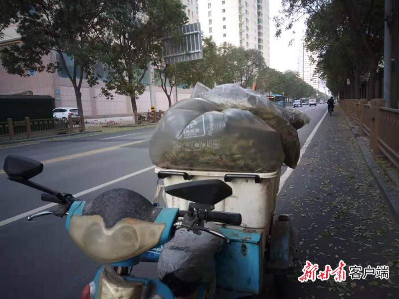 6时许,完成路面大清扫后,装袋的树叶被高高地码在垃圾车上,整整拉运了3车。此时地上仍有大量树叶。