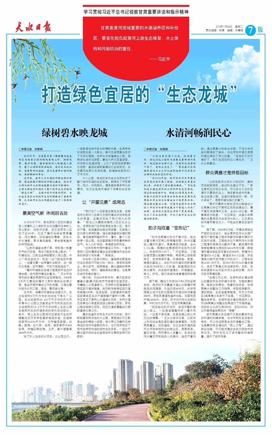 牢记嘱托,砥砺前行。市委、市政府把总书记系列指示精神作为做好新时代天水各项工作的根本遵循和行动指南,开拓创新,奋力前行,加快建设幸福美好新天水。结合“不忘初心、牢记使命”主题教育,天水日报社全媒体推出“学习贯彻习近平总书记视察甘肃重要讲话和指示精神”主题策划,将陆续从生态环境、脱贫攻坚、保障和改善民生、补齐全面建成小康社会短板等方面,对我市贯彻落实习近平总书记视察甘肃重要讲话和指示精神的举措成效进行报道,今日推出生态环境篇。