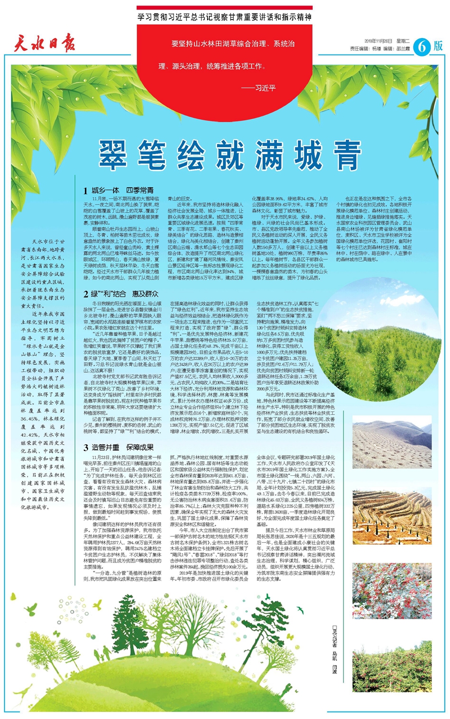 近年来我市国土绿化坚持以习近平生态文明思想为指导,牢固树立“绿水青山就是金山银山”理念,坚持绿色发展,实施工程带动,组织动员全社会开展了声势浩大的植树造林活动,取得了显著成效。目前全市森林覆盖率达到36.45%,林木绿化覆盖率达到42.42%,天水市相继荣获中国历史文化名城、中国优秀旅游城市和甘肃省园林城市等多项殊荣,目前正在积极创建国家园林城市、国家卫生城市和中国最佳历史文化旅游城市。