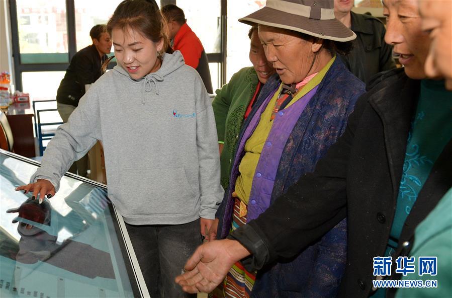 4月27日,在西藏山南市加查县冷达乡共康村电商服务站,工作人员白玛卓嘎(左前)向村民介绍电商服务。新华社记者 张汝锋 摄