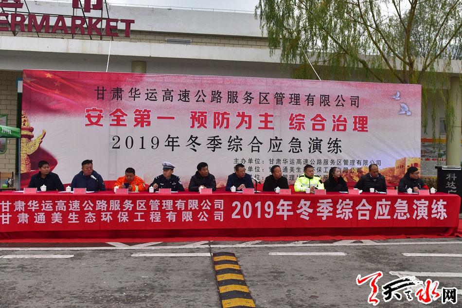 天天天水网讯(全媒体记者 周文涛)11月29日,甘肃华运高速公路服务区管理有限公司联合甘肃通美生态环保工程有限公司在天水管理片区甘谷服务区举行了2019年度冬季综合应急演练。演练以公司和服务区面临的冬季安全生产热点隐患为出发点,模拟了车辆在服务区追尾并引发火灾、食物中毒和服务区发生交通事故三种事故场景,通过发现-报告-指挥-警戒-救援-后期处置等多环节的情景再现和高效的现场处置,检验服务区现场处置预 案,锻炼现场应急队伍,不断提升服务区现场应急处置能力,努力打造安全稳定的高速公路服务区。