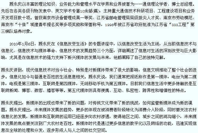 颜永庆 1989年南京邮电学院通信与电子系统专业硕士研究生毕业,2004年获得东南大学通信与信息系统专业博士学位。现任中国移动通信集团甘肃有限公司董事长、总经理。