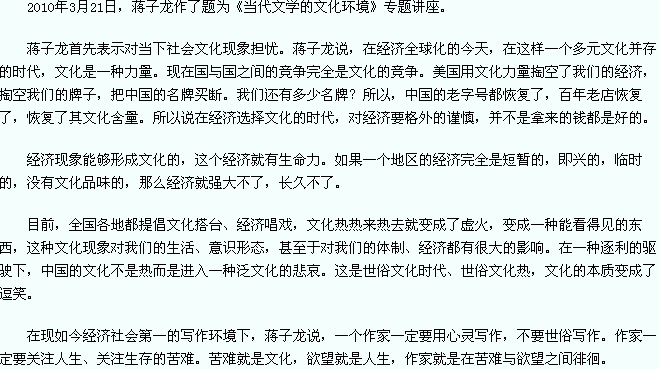 蒋子龙 现任中国作家协会副主席、天津作家协会主席,系当代著名作家,中国改革文学的奠基人。1962年开始发表作品。1976年以短篇小说《机电局长的一天》引起强烈社会反响。1979年以《乔厂长上任记》再次轰动社会,并获全国优秀短篇小说奖第一名;次年又以《一个工厂的秘书日记》再获此奖;1982年再次以《拜年》获得全国优秀短篇小说奖第一名。同时,以1980年的《开拓者》、1981年的《赤橙黄绿青蓝紫》、1984年的《燕赵悲歌》,共获得三届全国优秀中篇小说奖。著有长篇小说《蛇神》、《子午流注》、《人气》、《空洞》、《农民帝国》,以及中短篇小说集和散文集共90余种。1996年出版了八卷本的《蒋子龙文集》。