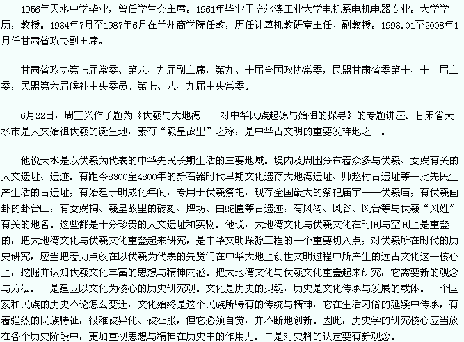 周宜兴,男,汉族,1937年10月生,甘肃省天水市人。