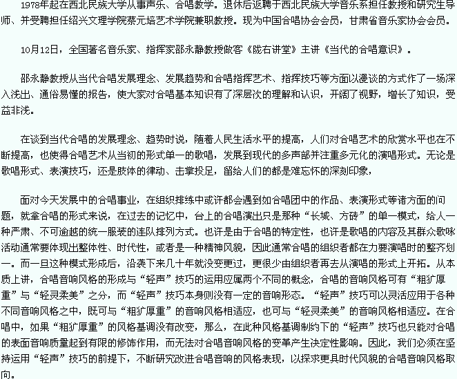 邵永静,1941年生,甘肃天水人,教授,全国著名音乐家、指挥家。1964年毕业于西北师范大学音乐系。先后在上海声乐研究所,中央乐团合唱指挥讲习班进修。在新疆兵团歌舞团工作18年,担任独唱演员、声乐教员,常年活跃在表演舞台上,在10多部歌剧中担任主要角色。