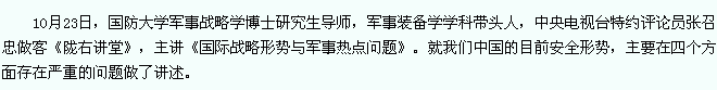张召忠,国防大学军事战略学博士研究生导师,军事装备学学科带头人,中央电视台特约评论员。先后在北京大学、国防大学、英国皇家军事科学学院学习,具有较高的外语水平,通晓阿拉伯语、英语,曾到伊拉克、美国、瑞士、意大利、以色列、英国、印度等国工作和访问。长期在作战部队、科研院所及军事院校工作,研究范围涉及科学技术、武器装备、联合作战、军事战略、国防建设、国际法规等多个学科领域。曾获国家及军队级科技进步奖和全军育才奖等多种奖励,享受国家政府特殊津贴和军队优秀人才岗位津贴,发表论文专著数千万字。