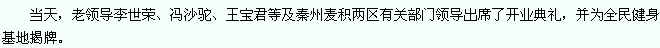天天天水网讯(记者 元存 晓霞 丽霞)11月23日,麦积区举行全民健身基地暨海滨健身会所开业典礼,正式成立了麦积区第一家民间资本投资建设的全民健身基地。