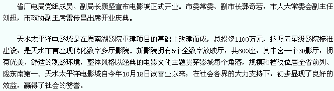 天天天水网讯(记者 杨璟)经过一段时间的试营业后,11月23日,天水市首座城市多厅数字电影院——天水太平洋电影城正式开业。
