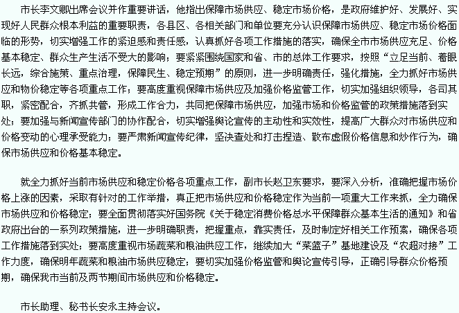 天天天水网讯(记者 王小亚)11月23日,全市保障市场供应稳定价格电视电话会议召开。会上,副市长彭鸿嘉宣读了市委书记、市人大常委会主任张景辉就保障市场供应维持价格稳定作出的重要批示;市商务局、发改委、粮食局结合各自职责就进一步保障市场供应稳定价格做了表态性发言。