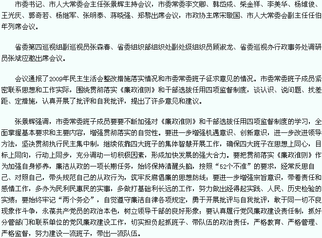 天天天水网讯(记者 杨璟)11月23日,围绕“贯彻落实《党员领导干部廉洁从政若干准则》,切实加强领导干部作风建设”这一主题,市委召开市委常委班子民主生活会,深入查找和剖析在贯彻《廉政准则》、加强作风建设方面存在的突出问题及原因,明确整改方向,提出改进措施,更好地指导全市经济社会跨越式科学发展。
