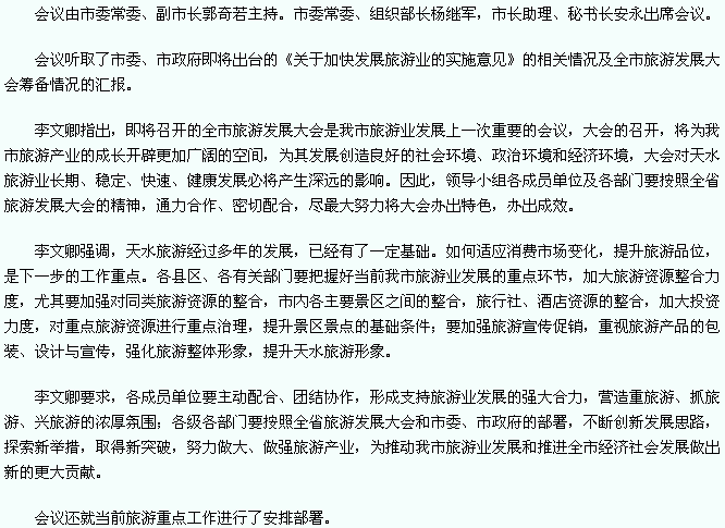 天天天水网讯(记者 王小亚)11月24日,市旅游产业发展领导小组第一次全体会议召开,市长李文卿强调,领导小组各成员单位及各县区、各部门,要认真研究和把握新形势下旅游发展的特点和规律,提高驾驭现代旅游经济发展的能力,及时解决旅游业发展中的重大问题,为推动我市旅游业发展和推进全市经济社会发展做出新的更大贡献。