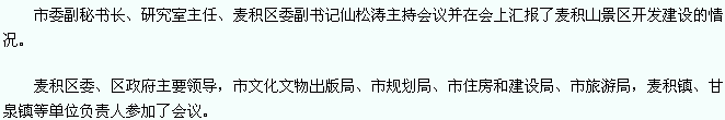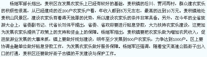 天天天水网-天水日报(特约记者汪成保)11月25日,市委常委、组织部长杨继军在麦积山景区开发建设会议上指出,麦积区委、区政府要高度重视,下大决心、花大气力把麦积镇农家乐建设成国内一流的农家乐,促进麦积旅游业的发展。