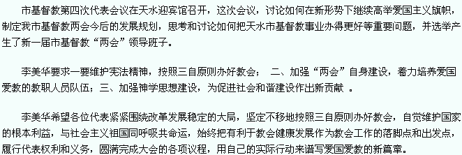 天天天水网-天水日报(记者 张树平)11月26日市委常委,统战部长李美华在市基督教第四次代表会议上要求,各位代表要继承和发扬光荣传统,利用自身的特殊影响,引导广大信教群众自觉维护国家统一和社会稳定,服务地方经济社会发展,促进我市区域发展战略的实施,为社会安定、宗教和谐和人民幸福做出新贡献。市领导朱正英, 道华出席会议。