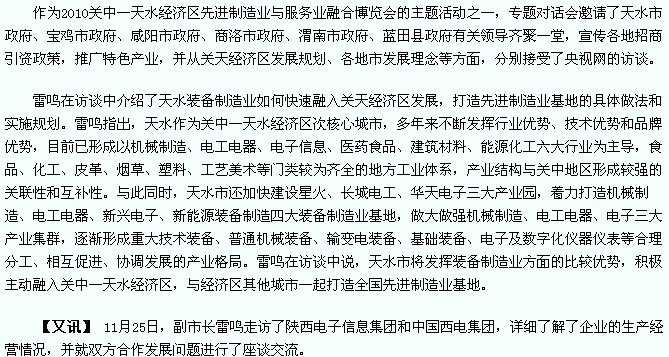 天天天水网-天水日报西安电(记者 孙镇) 11月26日,2010关中—天水经济区合作与发展市县(区)长专题对话会在西安曲江国际会展中心举行。副市长雷鸣出席对话会并接受央视网的访谈。