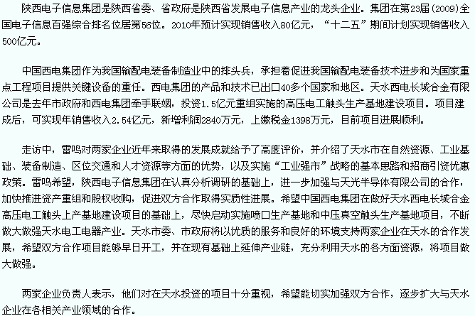 天天天水网-天水日报西安讯(记者 孙镇)11月25日,副市长雷鸣走访了陕西电子信息集团和中国西电集团,详细了解了企业的生产经营情况,并就双方合作发展问题进行了座谈交流,陕西电子集团副总经理唐大楷、中国西电电气股份有限公司副总经理丁小林等陪同。