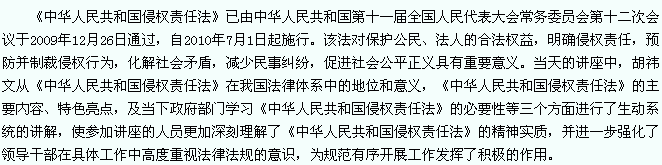 天天天水网-天水日报讯(记者 王小亚)为进一步提高广大干部依法执政、服务经济社会发展和处理危机的能力,11月29日,市政府举办《中华人民共和国侵权责任法》法制讲座,特邀天水师范学院经管院院长胡祎文作了专题辅导。市委副书记、市长李文卿,市长助理、市政府秘书长安永及市直部门负责人聆听了讲座。