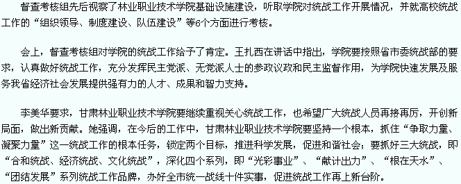 天天天水网-天水日报讯(记者 张树平) 11月30日,省委统战部、省高校工委督查考核组组长、西北民族大学党委副书记王扎西一行,在市委常委、统战部长李美华的陪同下,督查考核了甘肃林业职业技术学院统战工作。