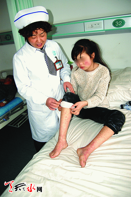 我是无意间发现自己腿上有许多针尖大小的紫红色小点的,感觉有点痒痒的。我给爸爸说后,爸爸赶紧把我带到了医院,医生看过后说我得的是过敏性紫癜。”2月14日上午,在市四O七医院接受治疗的13岁女孩小美(化名)对记者说。