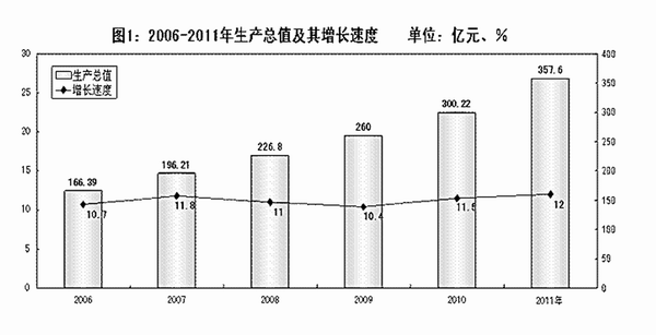 经济增长:全年全市实现生产总值[注]357.6亿元,按可比价格计算,比上年增长12%。其中第一产业增加值67亿元,增长7.6%;第二产业增加值142.2亿元,增长14.8%;第三产业增加值148.4亿元,增长11.5%,第一、二、三产业增加值占生产总值的比重为18.7:39.8:41.5。