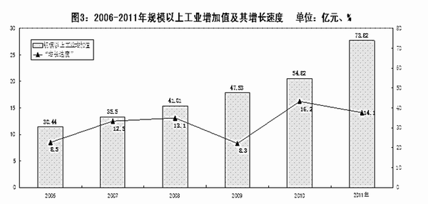 工业:全年全市规模以上工业企业实现工业增加值73.82亿元,比上年增长14.1%。其中市属工业企业完成增加值30.75亿元,增长6.7%。分轻重工业看,重工业增加值45.63亿元,增长9.2%;轻工业增加值28.19亿元,增长14.6%。分经济类型看,股份制企业增加值32.01亿元,增长6.6%;国有企业增加值39.2亿元,增长16%。