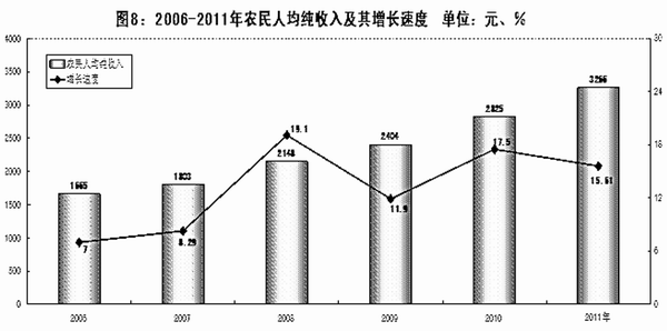 人民生活:全年全市城镇居民人均可支配收入13051元,比上年增长13.42%;农民人均纯收入3266元,增长15.61%。城镇居民人均消费性支出9280元,比上年增长11.8%;农民人均生活消费性支出2788元,增长15.54%。城市人均居住面积19.55平方米,农村人均居住面积19.73平方米。