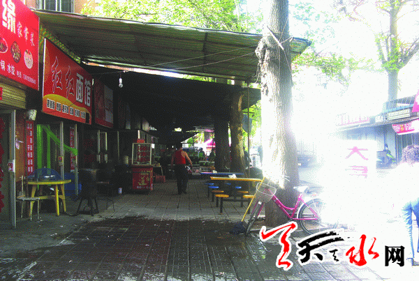 当记者走到安居小区后门处时,发现这里店铺占道经营的情况尤为严重,几家小卖部和卖水果的店铺不仅将摊点摆在自家店面门前的人行道上,还搭起了凉棚,行人被迫绕道到行车道上行走。