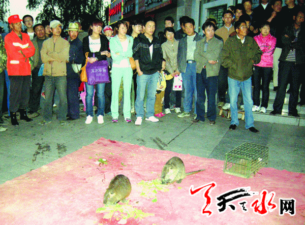 天天天水网-天水晚报讯(记者王晓华 通讯员窦耀辉)5月13日晚7时许,麦积区景园商厦东南侧一位中年妇女正在给爬在红地毯上的两只大老鼠喂食,吸引了不少市民围观拍照。