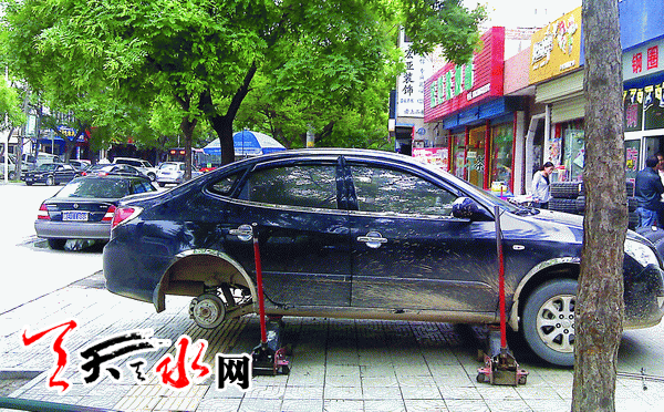 图三:秦州区新华路东段,修车的、补胎的、给车“美容”的,一天到晚把路堵得死死的。在五中便桥头,人行道被占用,车辆干脆停进了花坛里。