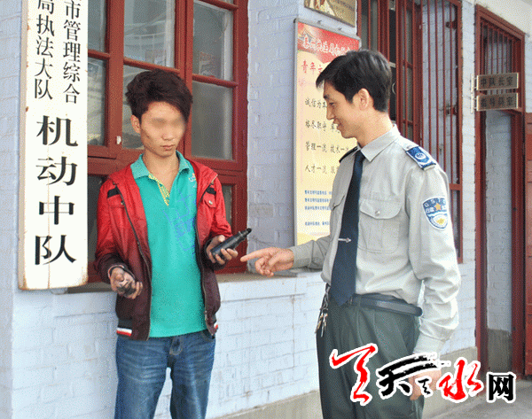 6月8日上午,记者在秦州区综合执法局机动中队见到了这名非法喷涂办证广告的男子,他的两只手被墨染得很脏。