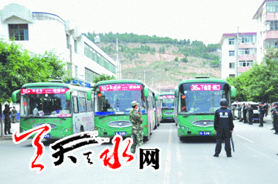 6时,随着总指挥的一声令下,全部在押人员按规定加戴械具,由武警和民警“一对一”带上经过严密安检、戒备森严的8辆公交车后,押解转移开始。
