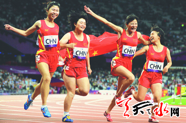 继在T38级女子100米决赛夺得银牌后,9月4日,天水选手陈君飞(右一)和队友曹远航、刘萍、熊德芝合作,在2012伦敦残奥委会田径女子4X100米接力T35/T38级决赛中,以55秒65的成绩获得银牌。