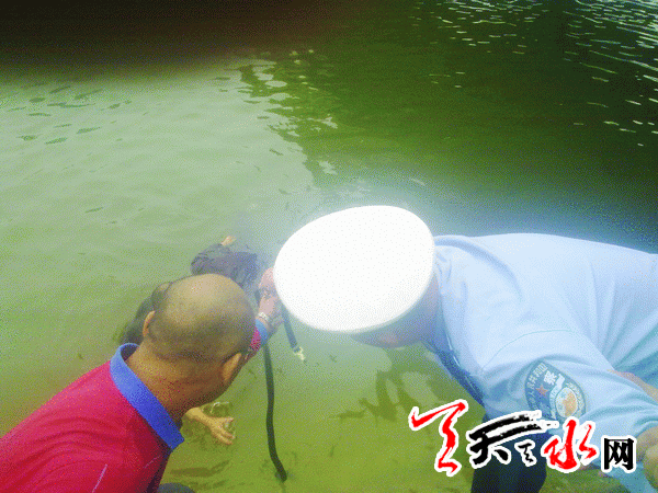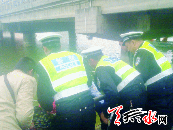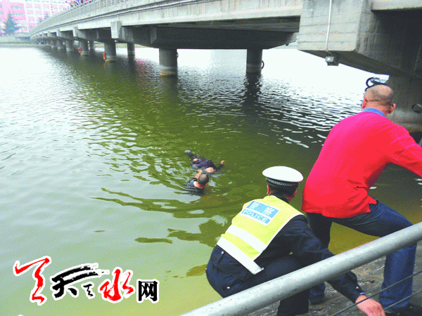 路人的惊呼声未止,一位交警已快步赶来,并勇敢地跳入天水湖中向落水者施救……