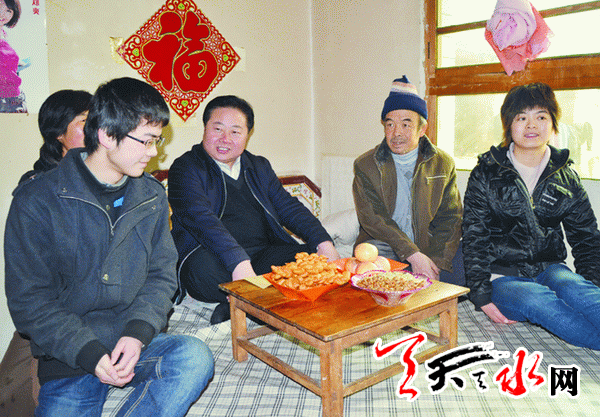 (市委书记马世忠(右三)与联系户陈小猫一家人亲切交谈。)